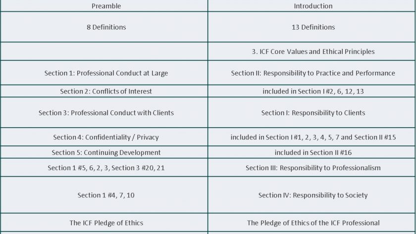 In response to an unasked question: Yes, during coach training the new Code of Ethics is now taught in all Center for Coaching Certification programs.