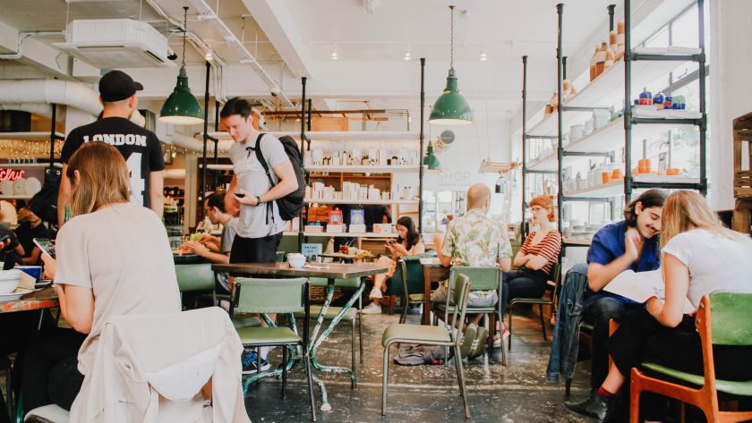 A large group of people are sitting around tables, men and women, working.